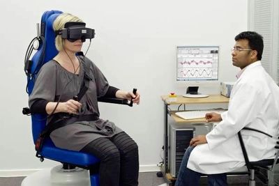 A rotational chair test is performed by securing the patient to a rotary chair which rotates at various speeds and directions while eye movements are recorded. Sinusoidal harmonic acceleration tests at several frequencies, visual-vestibular interaction tests, VOR suppression tests, and step velocity tests are frequently performed using the rotary chair test. The individual’s results are compared to the manufactures’ norms. Persons with two consecutive frequencies out of range are considered abnormal. Persons with unilateral vestibular lesions will often have spontaneous nystagmus in darkness which can create a bias and asymmetry towards the side of the lesion, but this is not always true. After compensation has occurred, gain tends to normalize, but phase generally remains asymmetric. More useful are the results obtained from this test in bilateral vestibular hypofunction. Persons with bilateral vestibular lesions will often demonstrate reduced gain across all frequencies. This may be the first abnormality in persons with vestibular loss associated with gentamicin use.